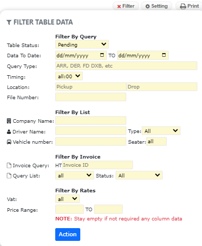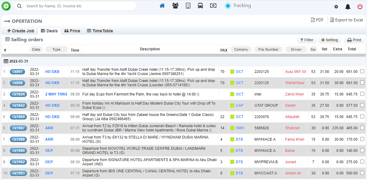 Receive jobs and then create the job with its specifications such as date, location, type, vehicle, driver, number of passengers and price etc.